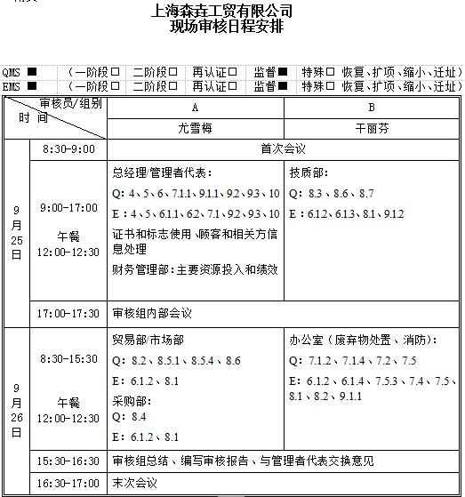本月的25號(hào)和26號(hào)我們將迎來質(zhì)量管理體系和環(huán)境管理換版后的第一次外部審核。具體審核的安排如下: