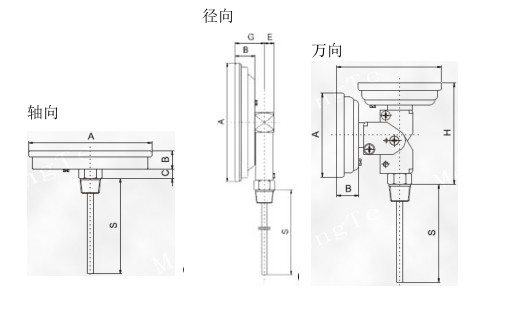 雙金屬溫度計是將繞成螺紋旋形的熱雙金屬片作為感溫器件,并把它裝在保護(hù)套管內(nèi),其中一端固定,稱為固定端,另一端連接在一根細(xì)軸上,稱為自由端。在自由端線軸上裝有指針。當(dāng)溫度發(fā)生變化時,感溫器件的自由端隨之發(fā)生轉(zhuǎn)動,帶動細(xì)軸上的指針產(chǎn)生角度變化,在標(biāo)度盤上指示對應(yīng)的溫度。今天給大家分享一下徑向,萬向,軸向雙金屬溫度計的結(jié)構(gòu)圖。