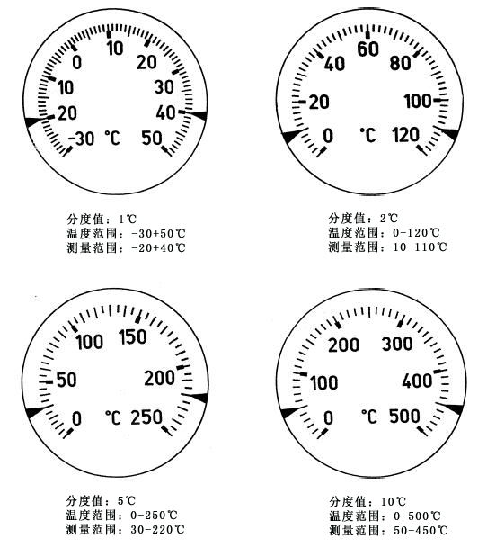 見下圖,通常-30+50℃分度值為1℃,0-120℃分度值為2℃,0-250℃分度值為5℃,0-500℃分度值為10℃。