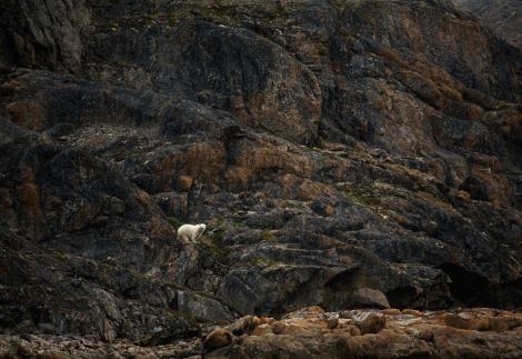 從這個圖片可以看出:冰山上的冰雪漸漸消融,露出了冰層下的巖石。一頭北極熊端坐在巖石上,孤獨地眺望遠方!