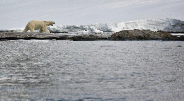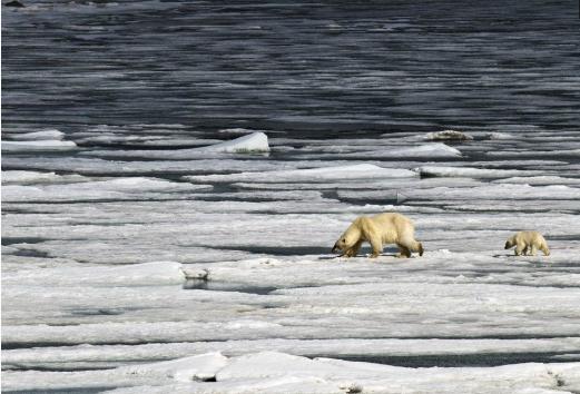 放眼望去,挪威的斯瓦爾巴特群島上覆蓋的冰雪已化成冰水,給北極熊覓食帶來了極大的困難。