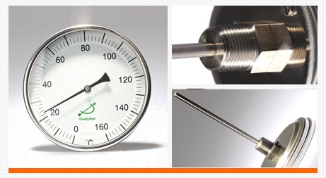 雙金屬溫度計(jì)的工作原理是是把兩片膨脹系數(shù)差異很大的金屬片焊在一起。當(dāng)溫度變化時(shí),差異很大的膨脹系數(shù)造成了不同的膨脹和收縮,致使金屬片產(chǎn)生彎曲變形。根據(jù)不同的變形而產(chǎn)生不同的轉(zhuǎn)動(dòng)量,轉(zhuǎn)動(dòng)量帶動(dòng)連接的轉(zhuǎn)軸和另一端的指示針,指示出了溫度。它可以直接測量各種生產(chǎn)過程中的-50℃~+500℃范圍內(nèi)液體、蒸汽和氣體介質(zhì)溫度。下圖則是國內(nèi)儀器設(shè)備上常用的一款雙金屬溫度計(jì)。
