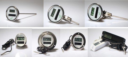 太陽能溫度計,是利用太陽能和有線傳感器提供精確的溫度指示。它是在光水平高于100LUX顯示的,當(dāng)光水平下降是,利用后備電池電路提供功率來持續(xù)顯示的。它的顯示屏材質(zhì)一般是LCD。