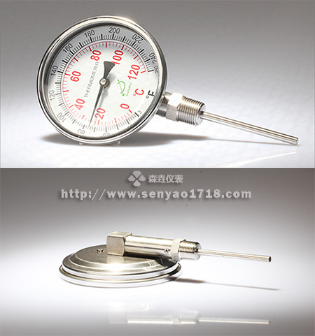 雙金屬溫度計是一種測量中低溫度的現(xiàn)場檢測儀表。雙金屬溫度計可以直接測量各種生產(chǎn)過程中的-80℃~+500℃范圍內(nèi)液體、蒸汽和氣體介質(zhì)溫度。雙金屬溫度計原理是將繞成螺紋旋形的熱雙金屬片作為感溫器件,并把它裝在保護(hù)套管內(nèi),其中一端固定,稱為固定端,另一端連接在一根細(xì)軸上,稱為自由端。在自由端線軸上裝有指針。當(dāng)溫度發(fā)生變化時,感溫器件的自由端隨之發(fā)生轉(zhuǎn)動,帶動細(xì)軸上的指針產(chǎn)生角度變化,在標(biāo)度盤上指示對應(yīng)的溫度。