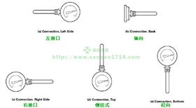 常見的雙金屬溫度計(jì)安裝方向有軸向,徑向,萬向,但是事實(shí)上,有時(shí)候?yàn)榱藵M足客戶的特殊要求,還有其他一些特殊的安裝方向:左接頭,右接口和倒掛式,圖示如下。