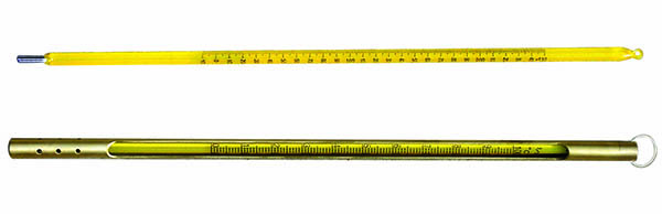 生活中我們所認知的實驗室溫度計,主要是整根的長玻璃棒溫度計,填充液煤油或者水銀等,依靠液體熱脹冷縮原理測溫。因其玻璃材質,必須小心輕放。